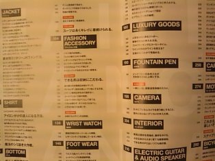 JACKETジャケット、SHIRTシャツ、BOTTOMボトム、FASHION ACCESSORYファッション小物、WRIST WATCH腕時計、FOOT WEAR靴、LUXURY GOODS嗜好品、FOUNTAIN PEN万年筆、CAMERAカメラ、INTERIORインテリア、ELECTRIC GUITAR&AUDIO APEAKERエレクトリックギター&オーディオスピーカー、OUTDDOR&SPORTSアウトドア&スポーツ、CAR車、MOTORCYCLEモーターサイクル、BICYCLE自転車と大きく15に分けて紹介しています。