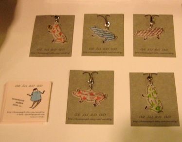 1つずつ全て手書きなんですよ! 他にも、ぶたのブローチやストラップ、ミニトートバックもあります