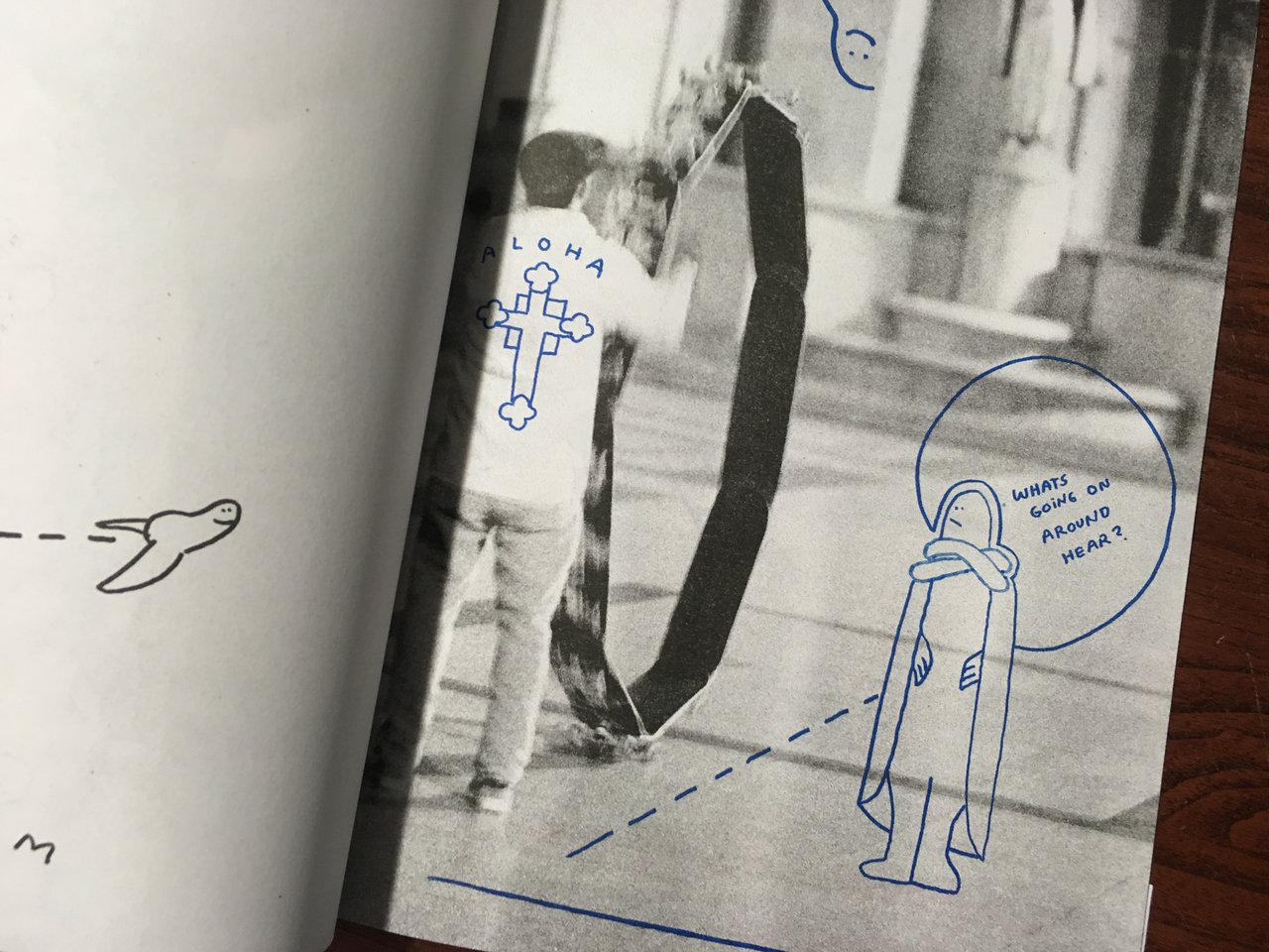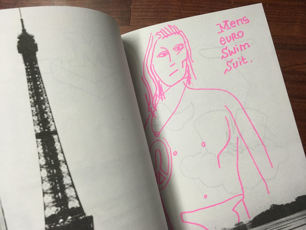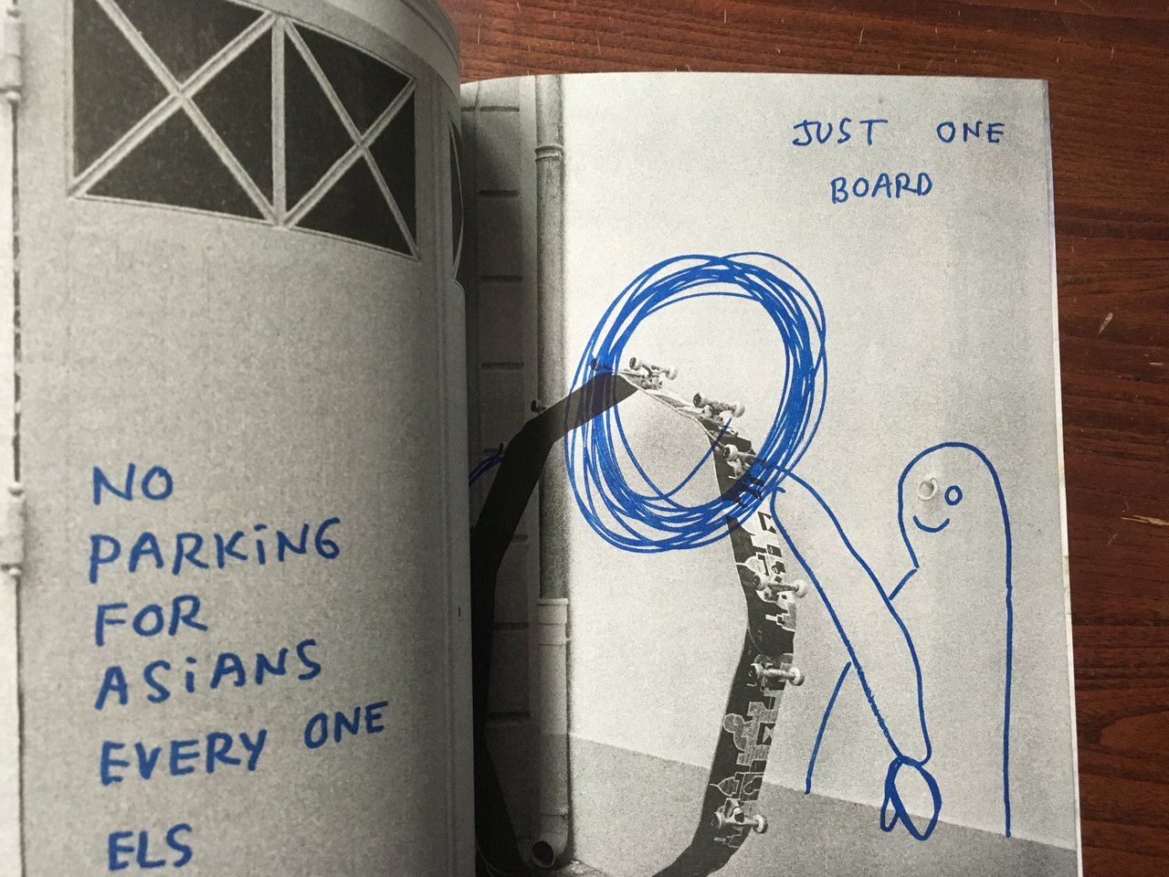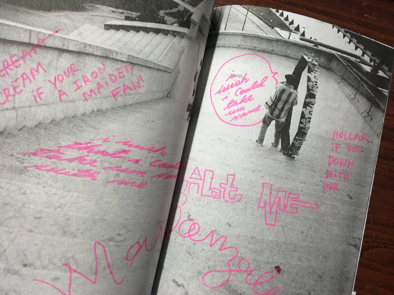 マーク・ゴンザレスが9枚のスケートボードをサークル状にした作品でパリの街を走り回る様子をベンジャミン・デュベールが撮影した作品集です。モノクロの粗い写真の中にピンクやブルーで描かれたマーク・ゴンザレスのイラストや言葉が印象的です。